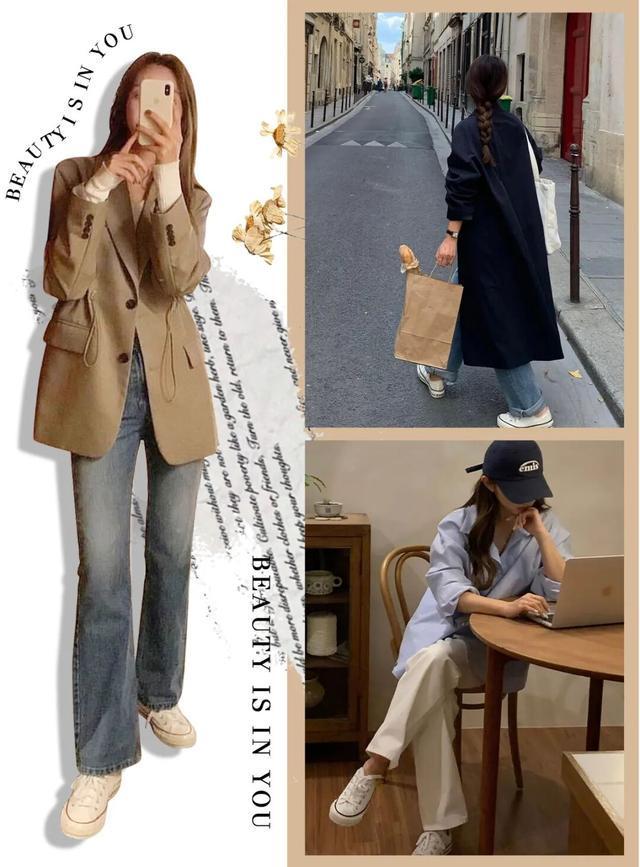 黑色我个人感觉穿搭门槛会比白色的高那么一点点,也就一点点,强烈建议你们尝试一下“西装外套+帆布鞋”这种混搭,巨适合大学生或者是初入职场的姐妹。