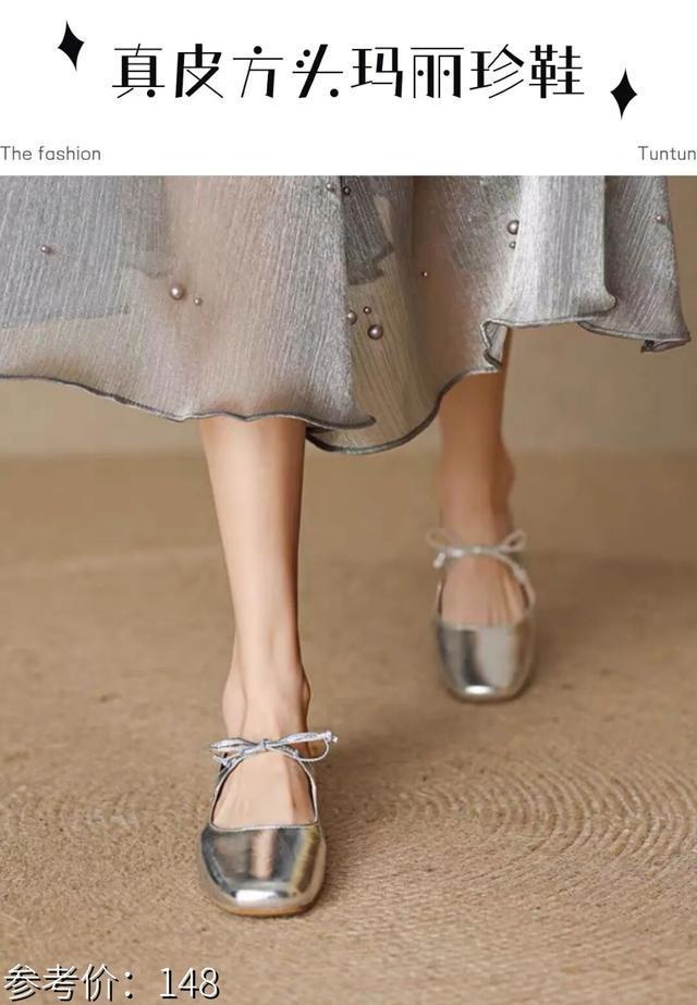 脚比较小或者是脚很瘦的姐妹一定一定要尝试一下这种有点芭蕾舞鞋的款式,亮面的银色材质质感一整个拉满,搭配各种连衣裙都不在话下。