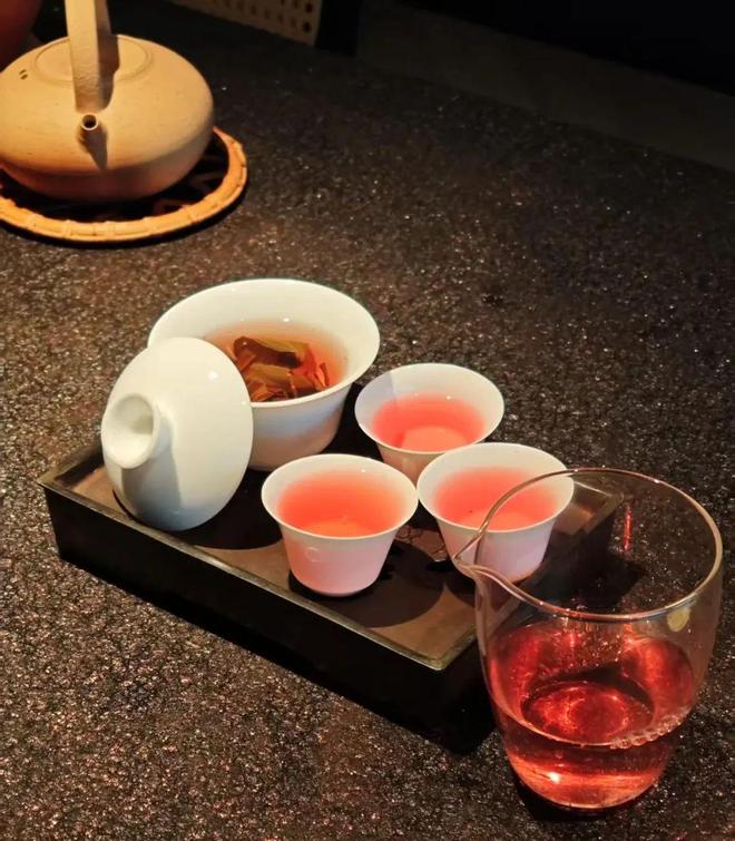 这样能让花青素等物质在矿泉水中持续产生氧化反应,使茶汤由最初的浅黄色逐渐变为迷人的“粉汤”,入口甜润、汤质饱满。