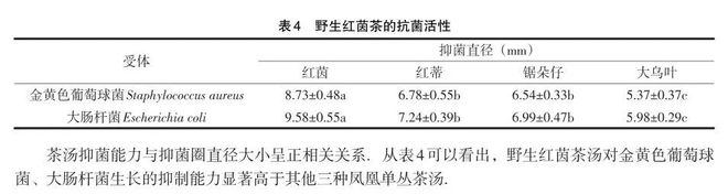 抗菌活性呈现的结果也如出一辙,四种凤凰单丛茶汤对金黄色葡萄球菌、大肠杆菌的抑菌直径从大到小次序均为:红茵>红蒂>锯朵仔>大乌叶。